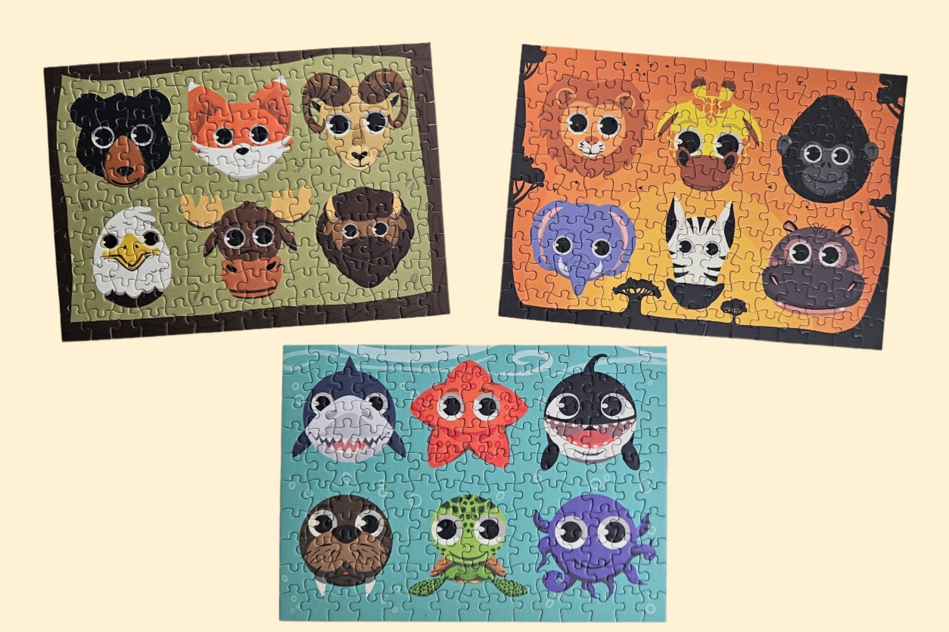 The Wildlife Collection includes three 150-piece mini puzzles featuring original artwork.